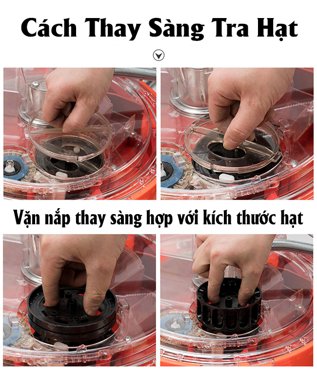 Máy có 10 sàng với đầy đủ kích thước để chúng ta có thể thay đổi cho phù hợp với kích thước hạt